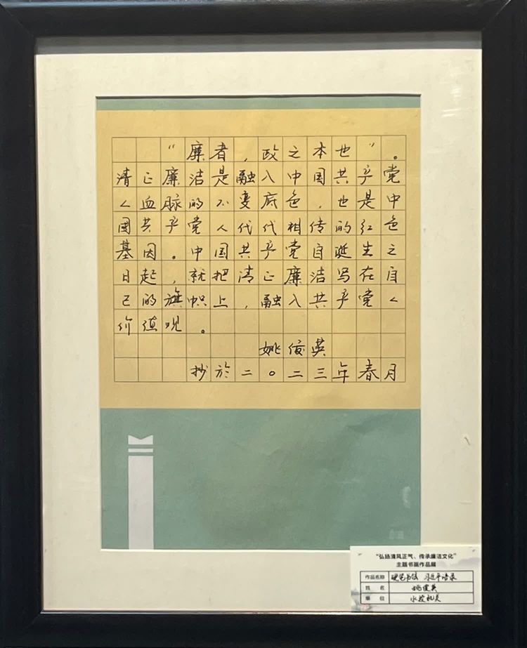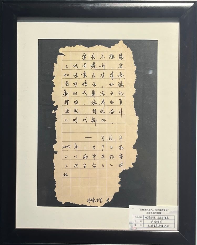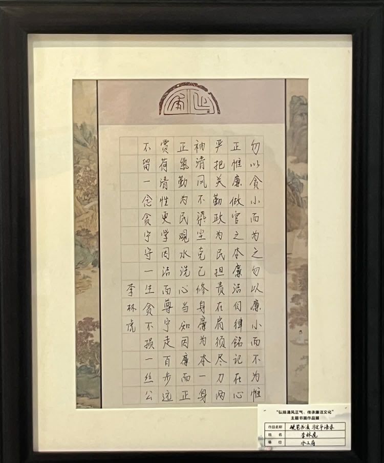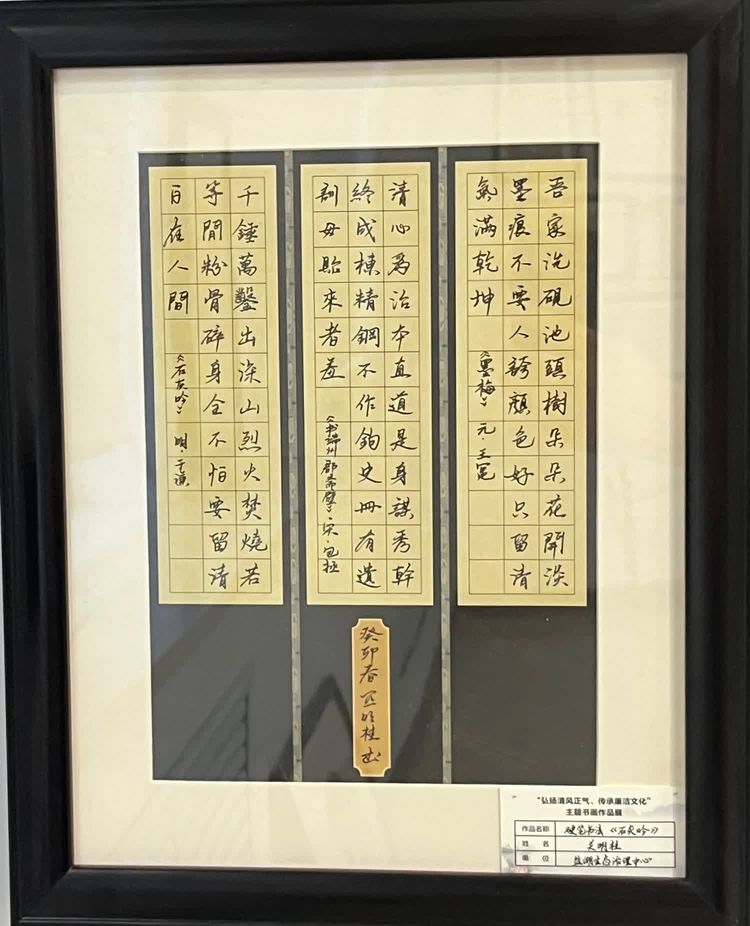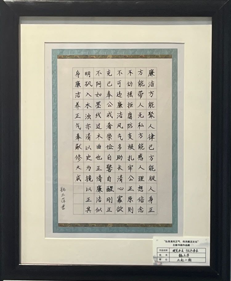 “清廉者,乃清正廉潔、大道直行、奉公守法也”“粉身碎骨渾不怕,要留清白在人間”“不要人夸好顏色,只留清氣滿乾坤”《清廉賦》、《石灰吟》、《墨梅》……一張張寫滿正氣的書法、一幅幅描繪廉潔的畫卷,傳遞著清正廉潔主旋律,弘揚著擔當實干正能量。