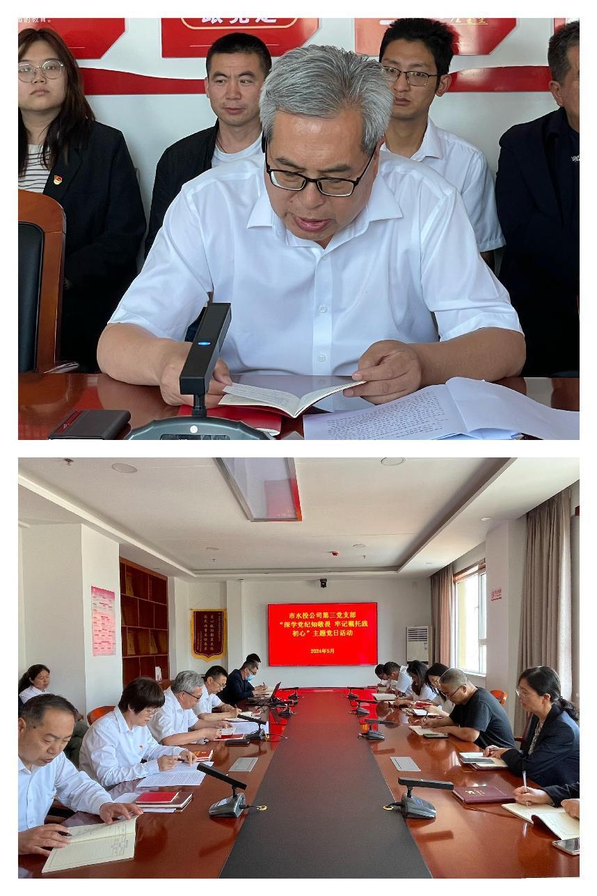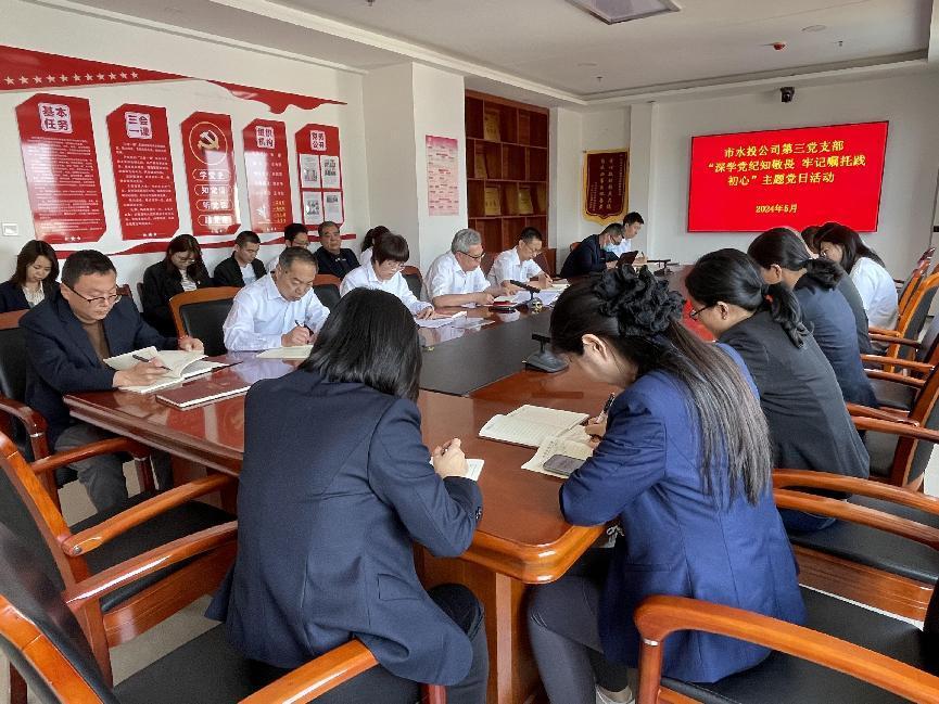 按照市委組織部《關于認真開展2024年5月黨支部主題黨日活動的通知》要求,結合水投公司黨委安排部署,5月6日下午,第三支部組織黨員開展了“深學黨紀知敬畏 牢記囑托踐初心”主題黨日活動。