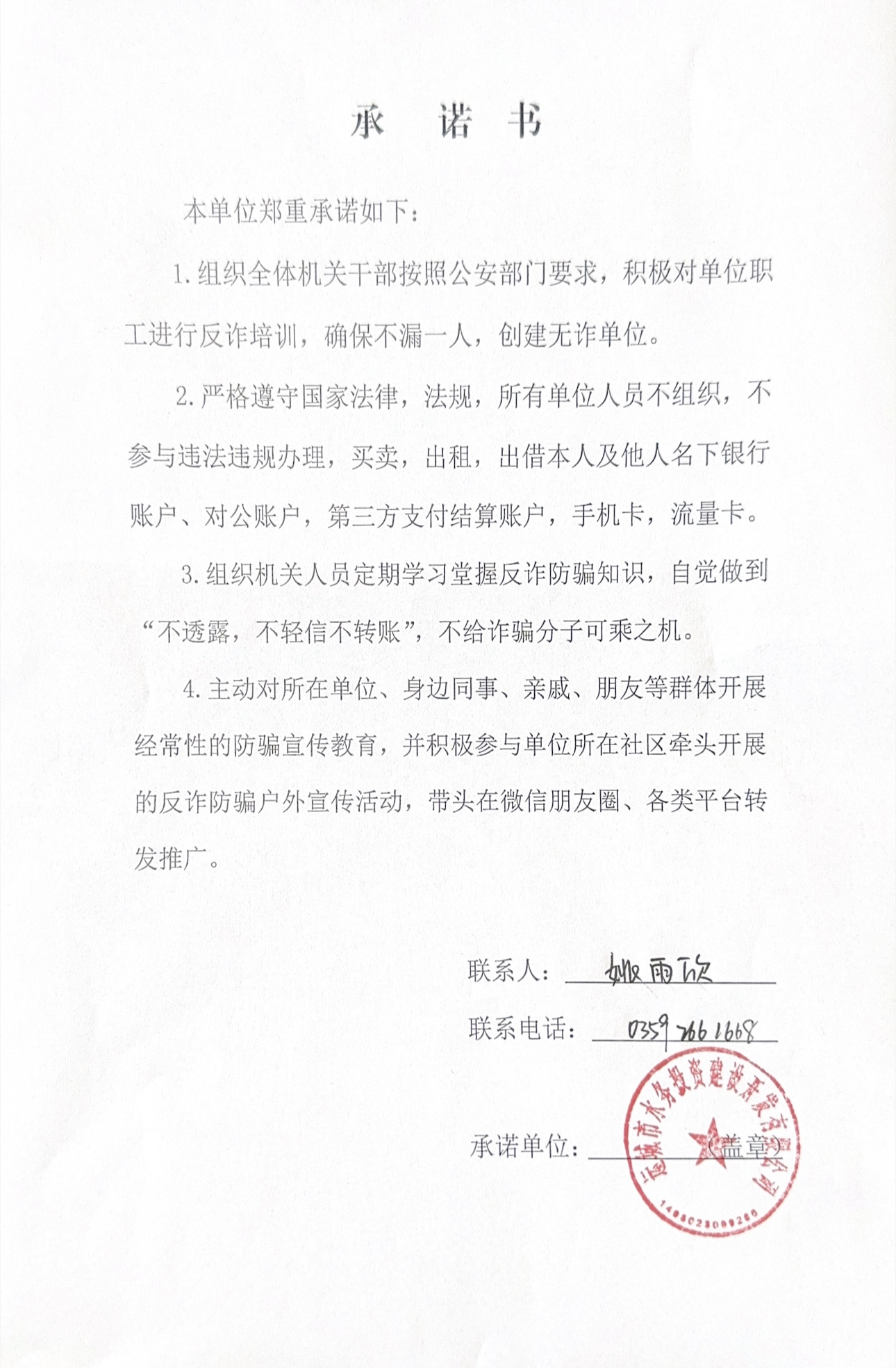 運(yùn)城水投公司反詐承諾書