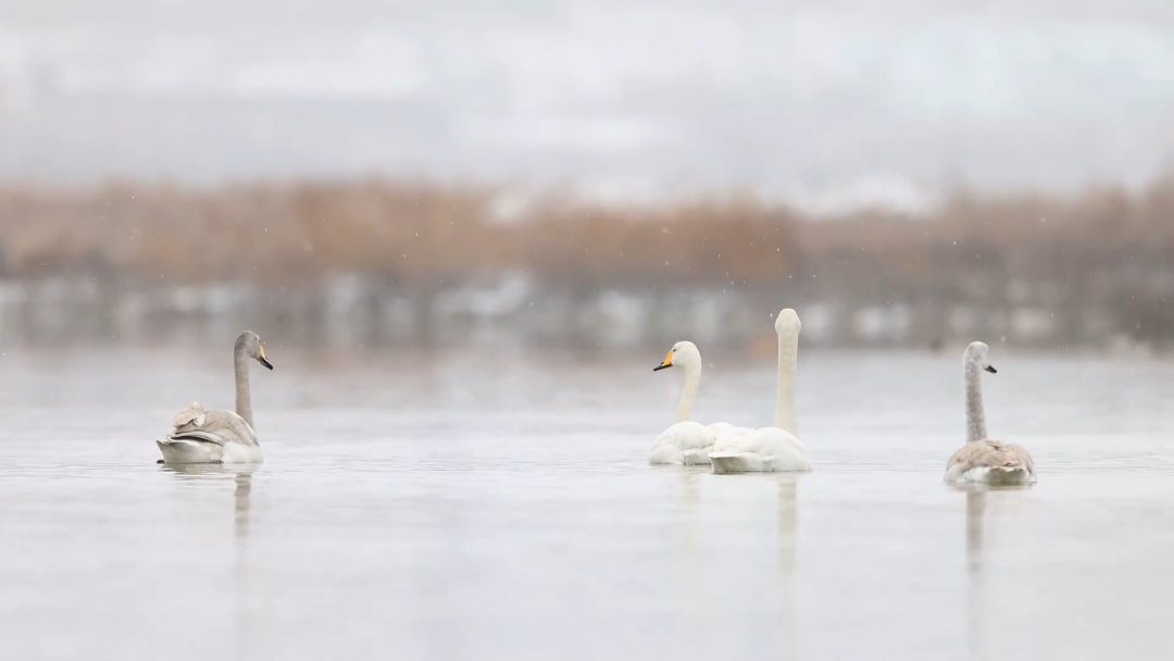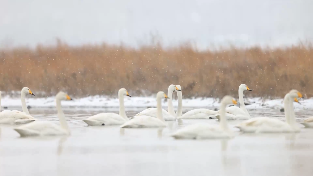 在鹽湖濕地東岸,近百只大天鵝在此棲息越冬,沐浴著雪花追逐、嬉戲、覓食。