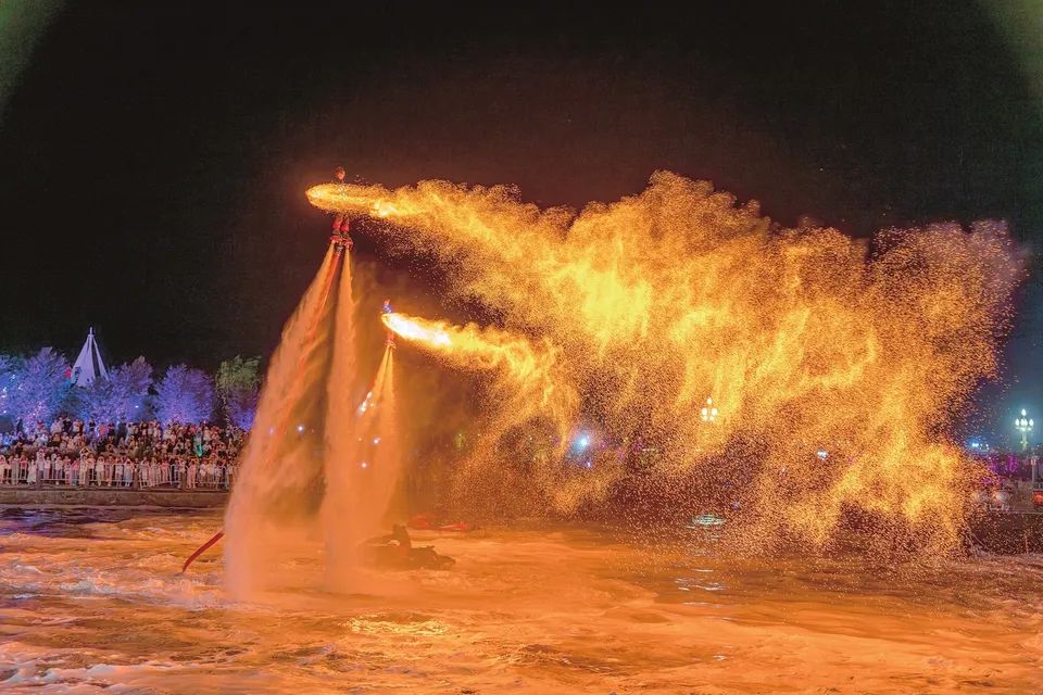 “五一”假期,鹽湖景區(qū)“水上飛人”為游客表演飛天火壺。閆鑫攝